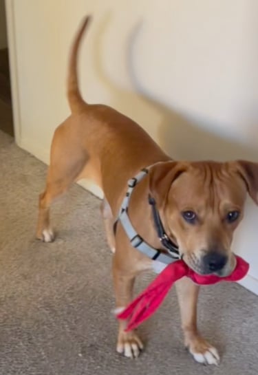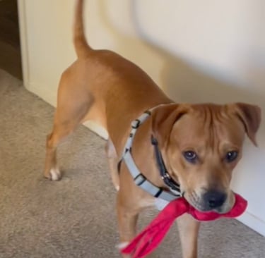 He's really gotten the hang of using his "Outside" button, and he's amazed me with his grasp of using it. It's been about two weeks since I introduced it to him (I'm omitting the post-neutering recovery), and he's really gotten comfortable using it. As he's made progress, I've had to allow him to reinforce the behavior by often taking him out multiple times in a row, but that commitment really cemented the use of the button for him. I'm now allowing him (with the exception of the pre-bedtime walk) to set his own schedule with the use of the button. We're taking longer walks, but they're fewer in number, and he sets the pace now. I've noticed an (apparent) increase in his confidence with its use. I say that because he's extremely frightened of garbage trucks; no doubt a lingering effect from his time "on the street" as a stray. He's normally reticent to go outside for walks on "garbage truck days" when he hears the trucks in our community backing up with their telltale back-up beeping, followed shortly thereafter with the sounds of hydraulics and then the inevitable crashing down of the dumpster. It really created panic when he first came home, often refusing to go outside most of the day. Since he began using his "Outside" button, he's able to choose when he feels comfortable going out, and he's willing to go out sooner than he did before the button's usage.
